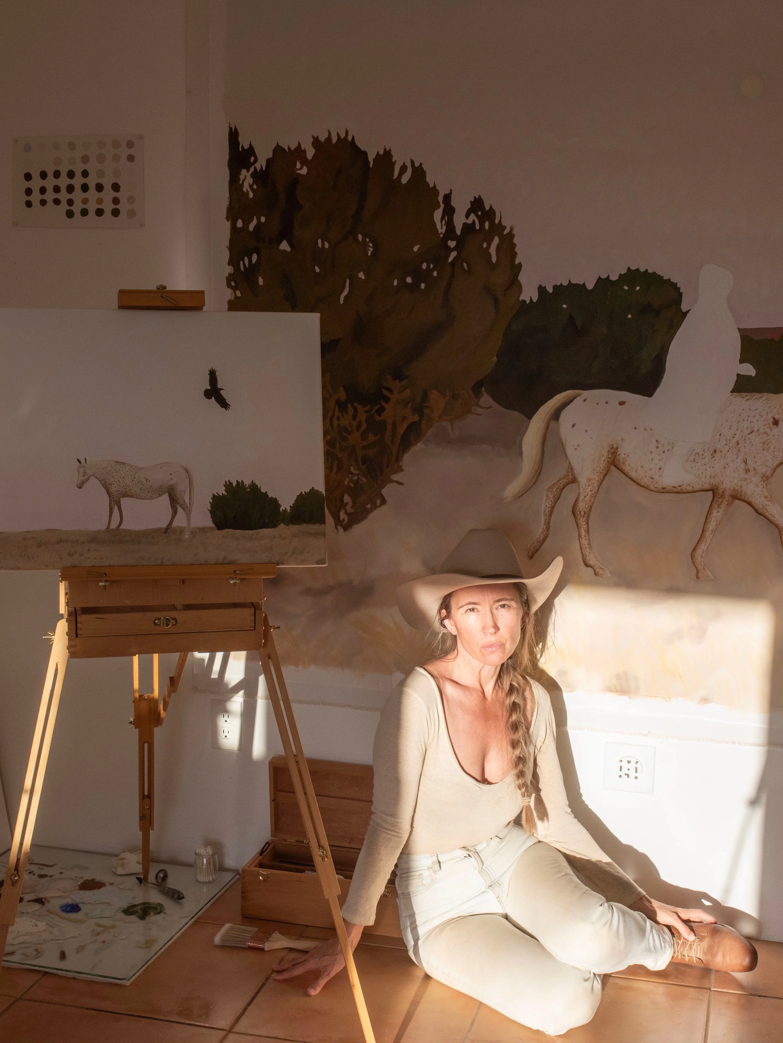 Stella Maria Baer is an earth pigment painter, photographer, horsewoman, mother, shepherdess, gardener, and rancher. Stella grew up in New Mexico and lives on a little ranch south of Santa Fe with her husband Seth and their three children. In these high mountain desert grasslands they tend two horses they rescued from kill pens: an Appaloosa named Moon and Stars and a baby pinto named Sky, a flock of wooly goats, and two sheepdogs.